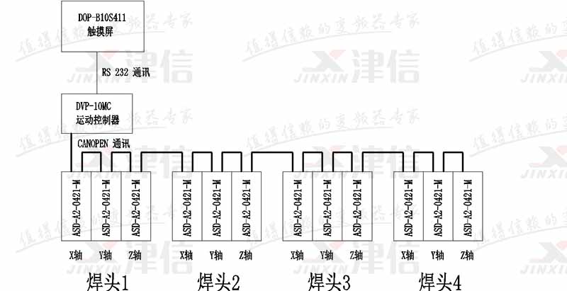 目前市場上以單焊頭超音波焊接機為主,但是單焊頭存在占用場地,效率低等缺點,所以上海津信為客戶推出了以臺達10MC11T和ASD-A2-0421-M型伺服驅動器為主開發的4焊頭超音波焊接機。